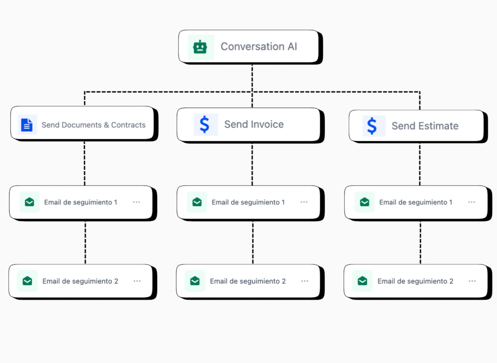 Un chatbot tradicional responde con frases predefinidas. Un Agente IA conversa de forma natural, entiende contexto, maneja objeciones y puede ejecutar acciones como enviar PDFs, contratos o links de pago.